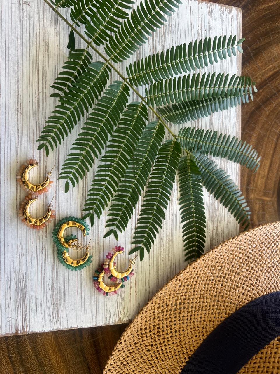 Diseñados en una forma curva elegante, estos aretes combinan una base dorada con cuentas y piedras naturales que aportan textura, brillo y personalidad.