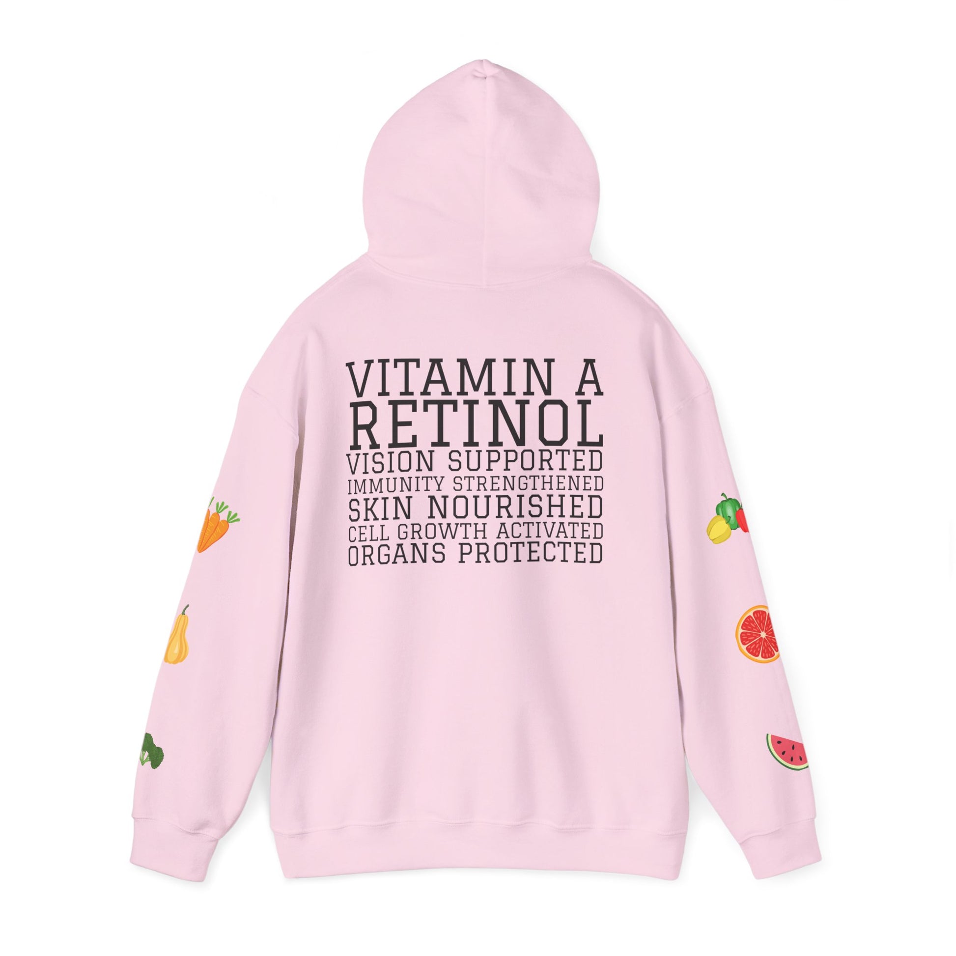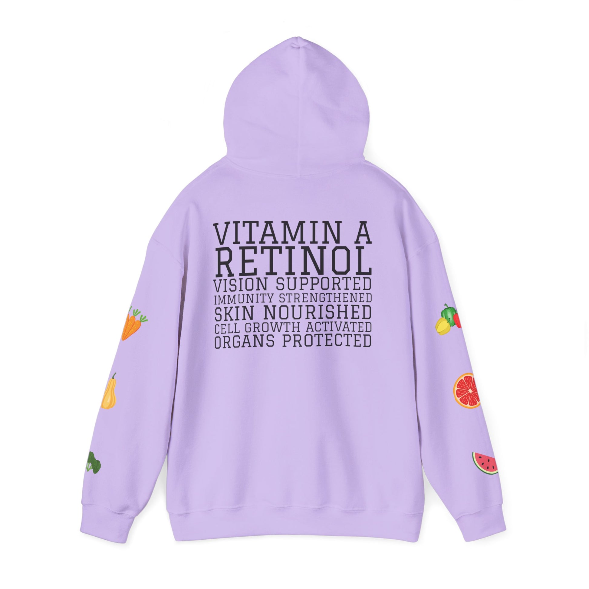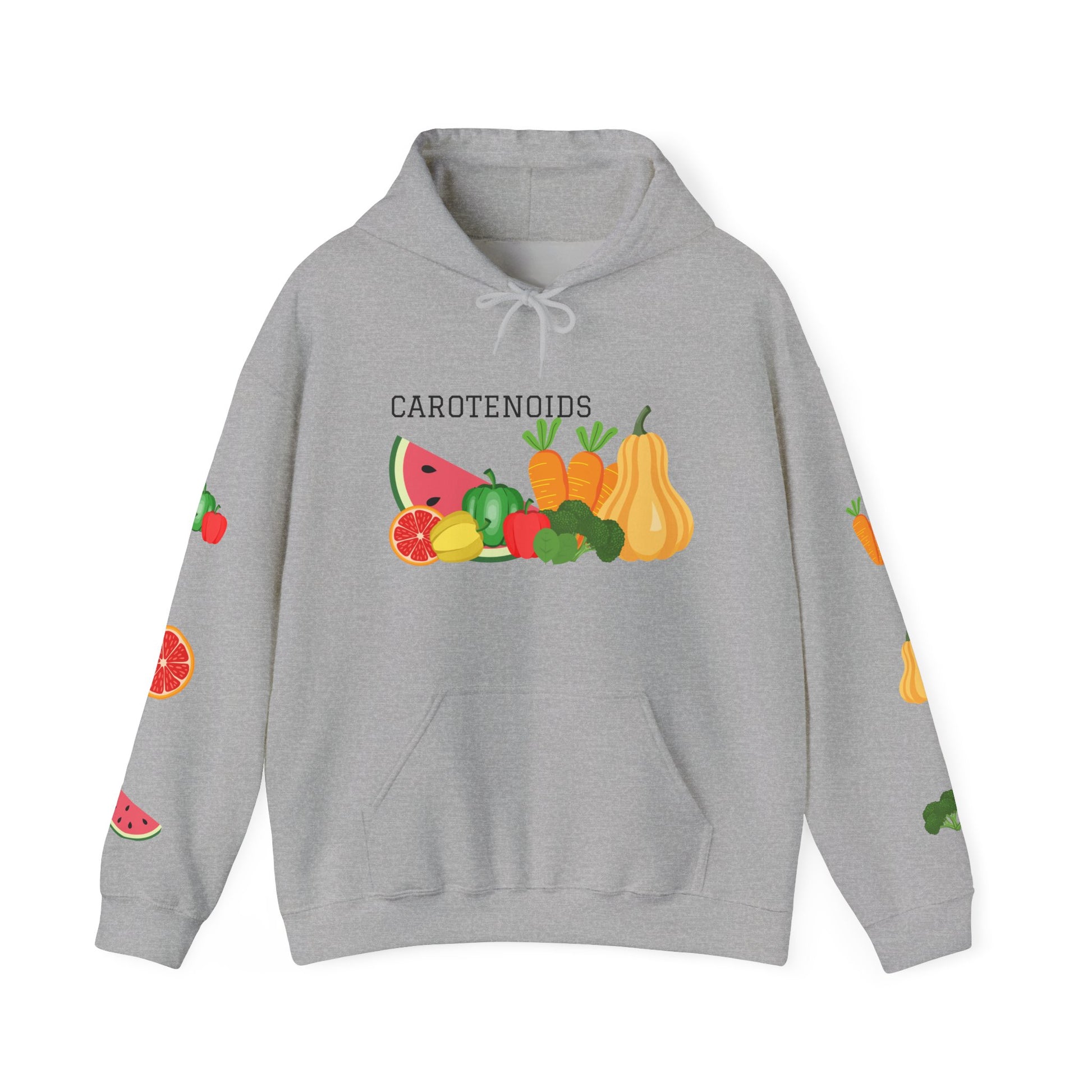 This cozy hooded sweatshirt brings science-forward produce art to everyday wear. Soft, medium-heavy fleece cradles you while playful watercolor-style fruits and veggies peek from the sleeves and chest. The front names the nutrient—CAROTENOIDS—over a cheerful cluster of watermelon, carrots, squash and greens. On the back, a typographic list explains benefits like “RETINOL • VISION SUPPORTED • SKIN NOURISHED,” turning the hoodie into a wearable reminder of why whole foods matter. It hangs relaxed over jeans or lounge pants and keeps an active, health-minded person warm during morning market runs, study sessions, or evening walks. Thoughtful details — double-lined hood, color-matched drawcord, roomy kangaroo pocket — make it comfortable and durable enough for daily wear, while the printed neck label and optional embroidery placements let this piece feel custom and finished.