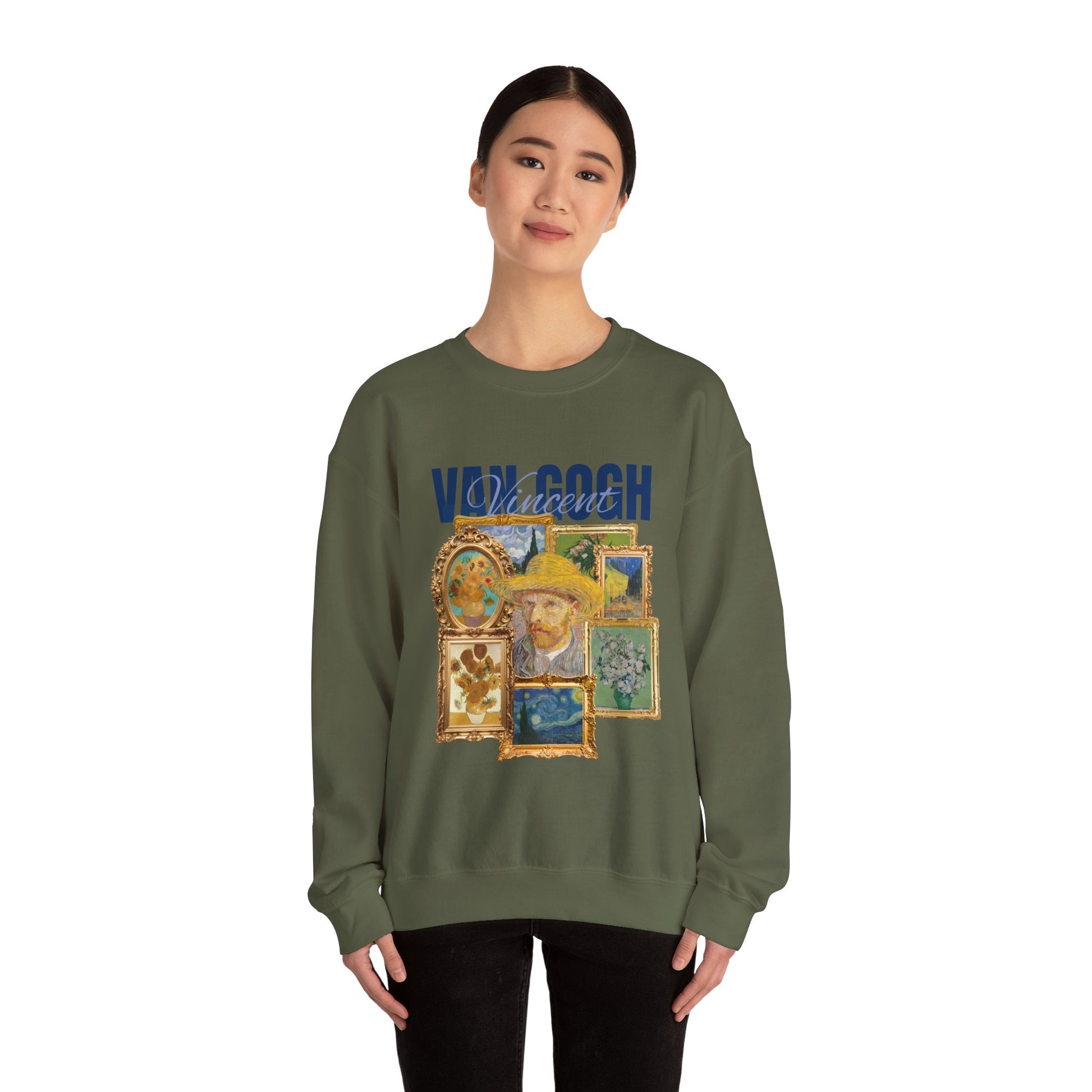 A cozy, classic Van Gogh bootleg crewneck sweatshirt featuring his self-portrait, Starry Night, and more of his famous works.
